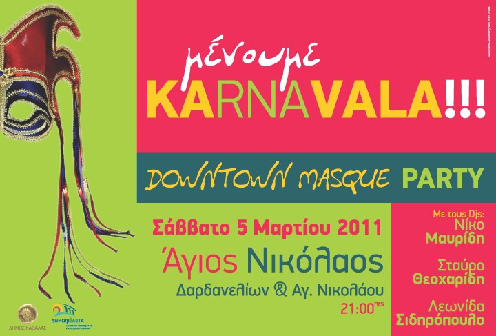Ο Δήμος Καβάλας και η ΔΗΜΩΦΕΛΕΙΑ καλούν όλους του Καβαλιώτες καρναβαλιστές το Σάββατο 5 Μαρτίου 2011 στον Άγ. Νικόλαο (Δαρδανελίων & Αγ. Νικολάου) στις 21.00 για ένα ξέφρενο πάρτυ στα στενά της περιοχής υπό τις μουσικές επιλογές των djs Νίκου Μαυρίδη, Σταύρου Θεοχαρίδη και Λεωνίδα Σιδηρόπουλο.